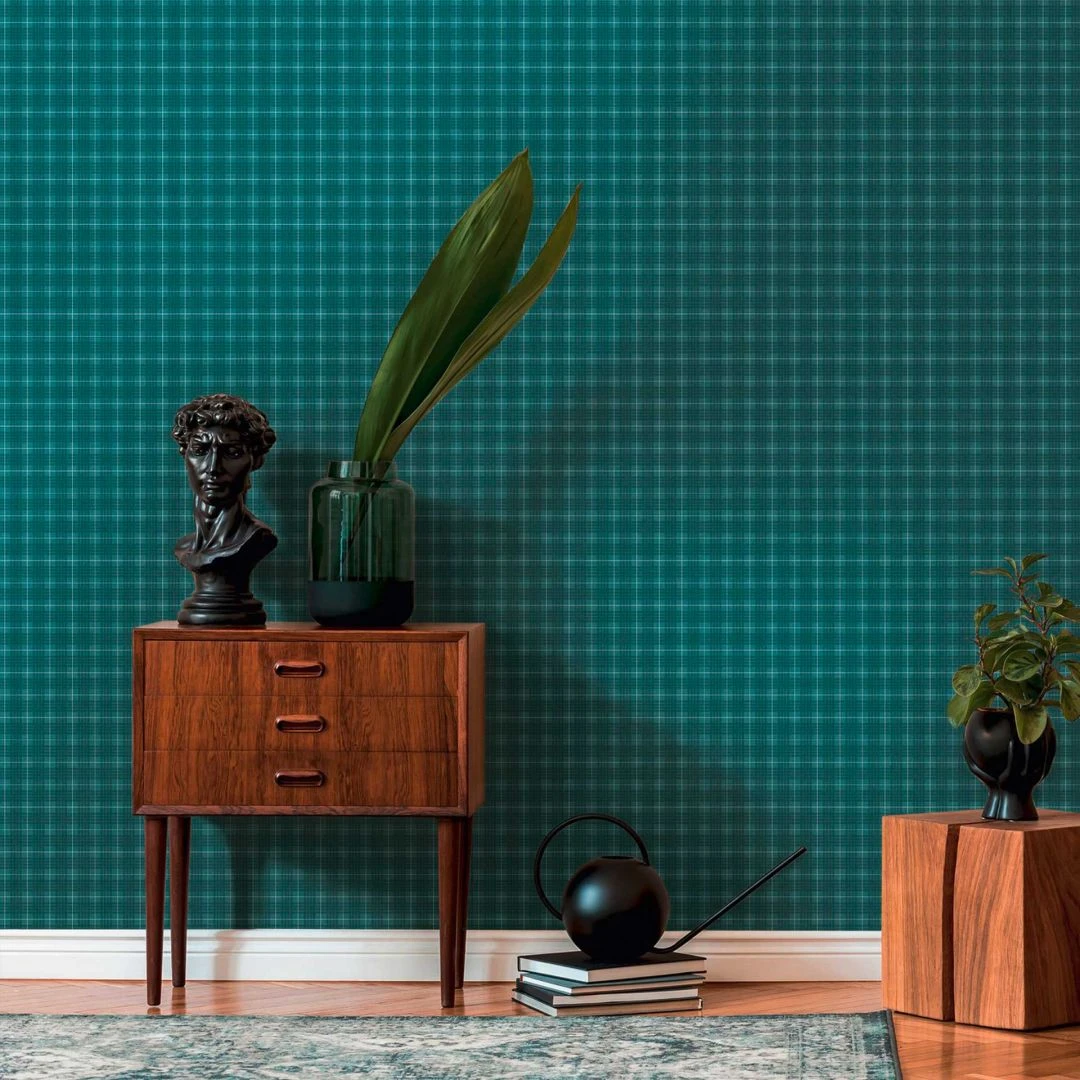 Vintage papier peint à carreaux Vert Bleu – papier peint à motifs rétro à carreaux – papier peint intissé moderne